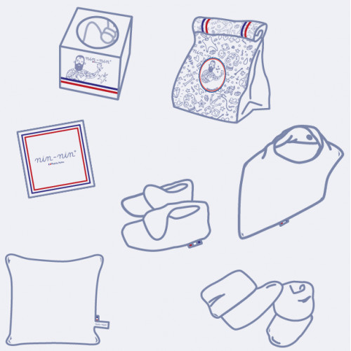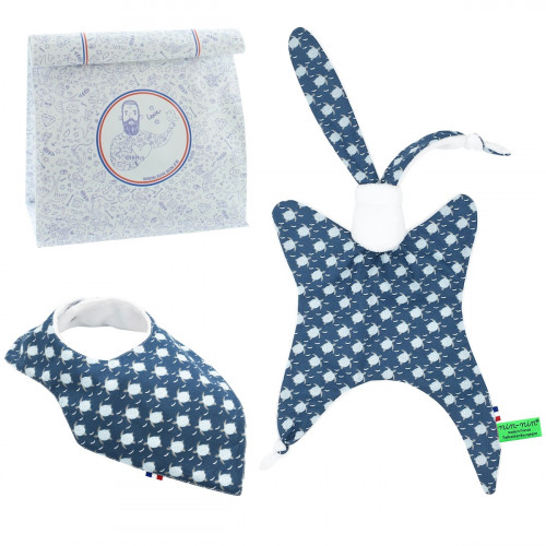 This birth box contains 1 Nin-Nin (cuddly toy) delivered in a tattooed cube (box), 1 Bib Bandana all delivered in 1 Lunch Bag accompanied by 1 Congratulations Card.