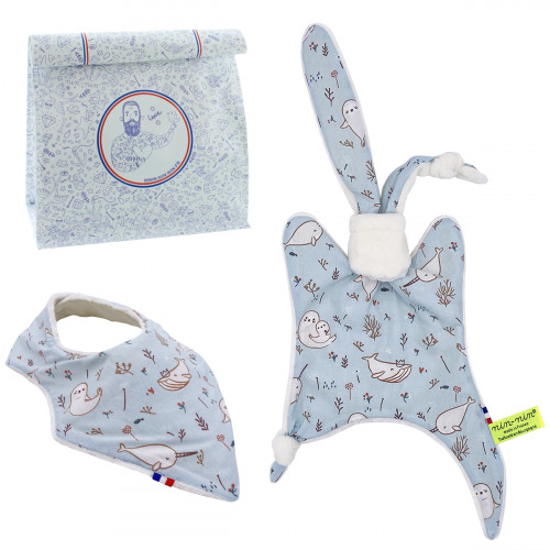 Birth gift baby comforter and bandana bib Nimbus Bleu. Made in France. Nin-Nin