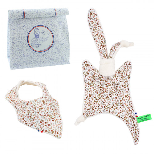 This birth box contains 1 Nin-Nin (cuddly toy) delivered in a tattooed cube (box), 1 Bib Bandana all delivered in 1 Lunch Bag accompanied by 1 Congratulations Card.