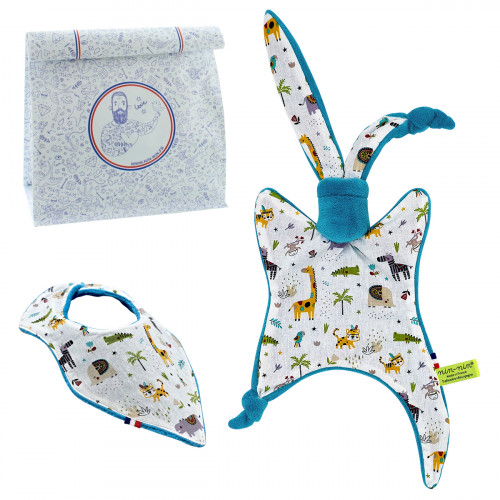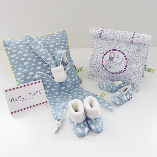 This birth box contains 1 Nin-Nin (cuddly toy) delivered in a tattooed cube (box), 1 Bib Bandana all delivered in 1 Lunch Bag accompanied by 1 Congratulations Card.