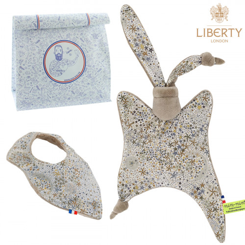 This birth box contains 1 Nin-Nin (cuddly toy) delivered in a tattooed cube (box), 1 Bib Bandana all delivered in 1 Lunch Bag accompanied by 1 Congratulations Card.