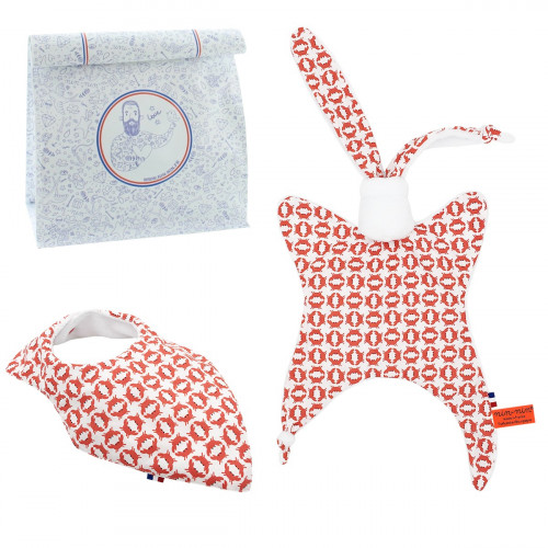 This birth box contains 1 Nin-Nin (cuddly toy) delivered in a tattooed cube (box), 1 Bib Bandana all delivered in 1 Lunch Bag accompanied by 1 Congratulations Card.