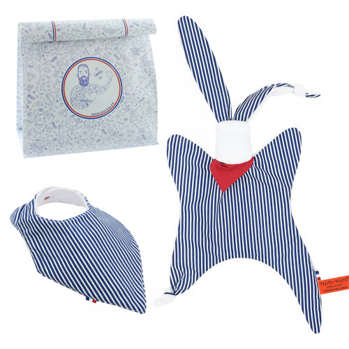 This birth box contains 1 Nin-Nin (cuddly toy) delivered in a tattooed cube (box), 1 Bib Bandana all delivered in 1 Lunch Bag accompanied by 1 Congratulations Card.