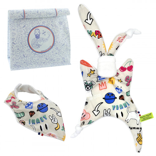 This birth box contains 1 Nin-Nin (cuddly toy) delivered in a tattooed cube (box), 1 Bib Bandana all delivered in 1 Lunch Bag accompanied by 1 Congratulations Card.