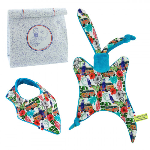 This birth box contains 1 Nin-Nin (cuddly toy) delivered in a tattooed cube (box), 1 Bib Bandana all delivered in 1 Lunch Bag accompanied by 1 Congratulations Card.