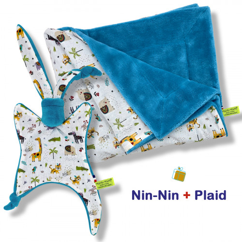 Ce coffret de naissance contient 1 Nin-Nin (doudou) livré dans un cube (boîte) tatoué, 1 Bavoir Bandana le tout livré dans 1 Lunch Bag accompagné d'1 Carte de Félicitation.