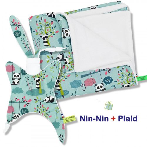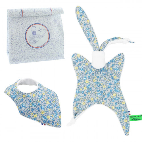 Ce coffret de naissance contient 1 Nin-Nin (doudou) livré dans un cube (boîte) tatoué, 1 Bavoir Bandana le tout livré dans 1 Lunch Bag accompagné d'1 Carte de Félicitation.