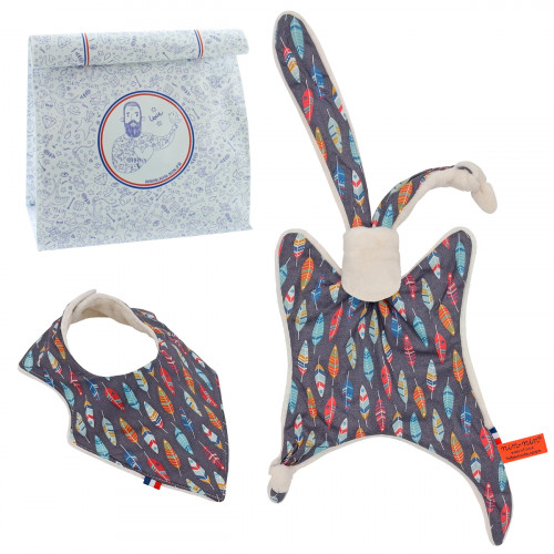 Ce coffret de naissance contient 1 Nin-Nin (doudou) livré dans un cube (boîte) tatoué, 1 Bavoir Bandana le tout livré dans 1 Lunch Bag accompagné d'1 Carte de Félicitation.